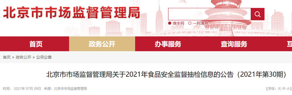 北京市市場監(jiān)督管理局關于2021年食品安全監(jiān)督抽檢信息的公告(2021年第30期)